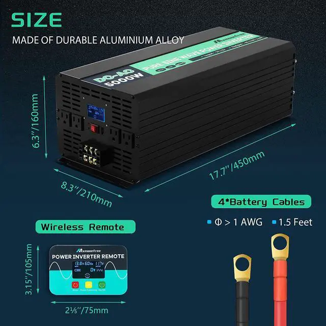 5000W Pure Sine Wave Power Inverter 12V DC to 110V AC with Wireless Remote Control LCD Display 1 USB Port, 4 AC Outlets, 1 Terminal Blocks for RV Truck Cabin Off Grid