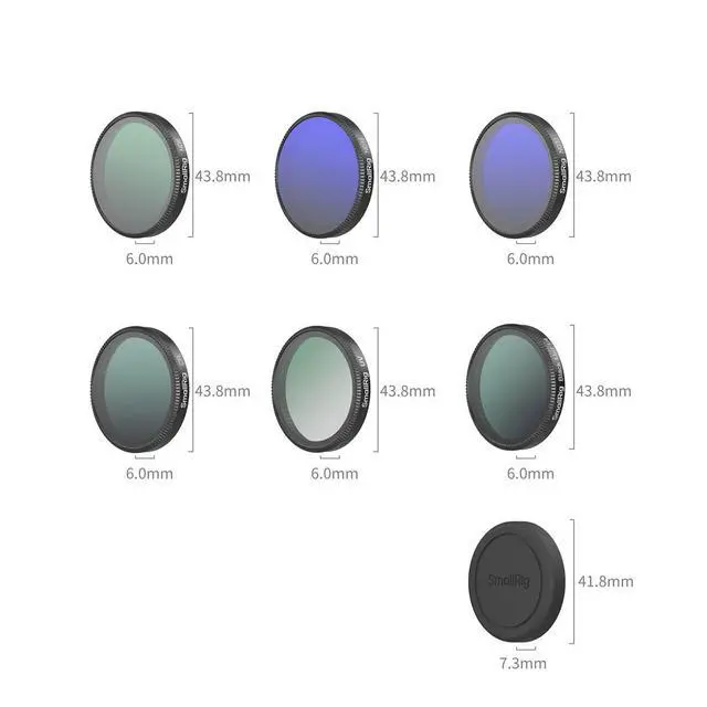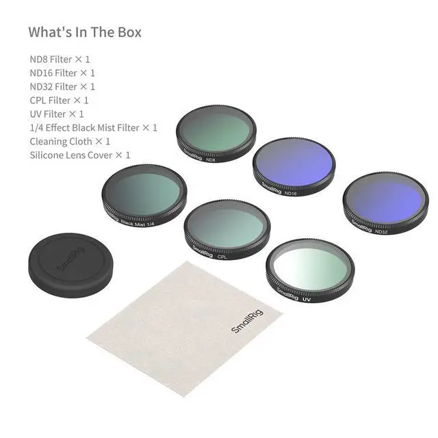 SmallRig Filter Kit for DJI Osmo Action 6 5967 is specifically designed for the DJI Osmo Action 6. This comprehensive filter kit features advanced multi-layer coating technology that precisely controls light across all wavelengths to enhance image clarity and color performance. Crafted from premium Rainbow high-alumina glass, these filters offer exceptional durability with excellent impact and wear resistance, ensuring clear, vibrant footage in any shooting scenario. The package includes an ND8 filter, an ND16 filter, an ND32 filter, a CPL filter, a UV filter, a 1/4 effect black mist filter, a silicone lens cover, and a cleaning cloth.