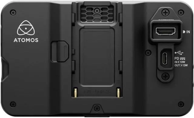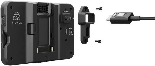 The monitor has been slimmed down to weigh only 7.4 oz, and there are added locating holes alongside the 1/4"-20 threads for anti-twist mounting. A single L-series battery plate on the back has been placed in the center to improve balancing and maneuverability. The included HDMI/USB-C locking adapter allows you to use Atomos' new line of locking cables to prevent disconnecting or pulling.