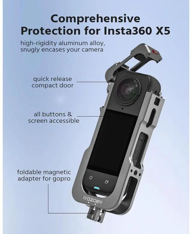 This Camera Cage offers additional protection for the Insta360 X5 and improves flexibility for mounting and operating the action camera. The cage features several mounting options for a variety of accessories including a 1/4"-20 thread with locating points and a Cold Shoe Receiver. The quick release design allows the cage to be installed or removed quickly for fast access to the camera body. The Rotatable Support Bracket swivels 90 Degree which enables users to set the camera down on a flat surface without scratching the lens and the cage. The cage features shock absorbing padding that helps stabilize the system as well as provides additional protection.