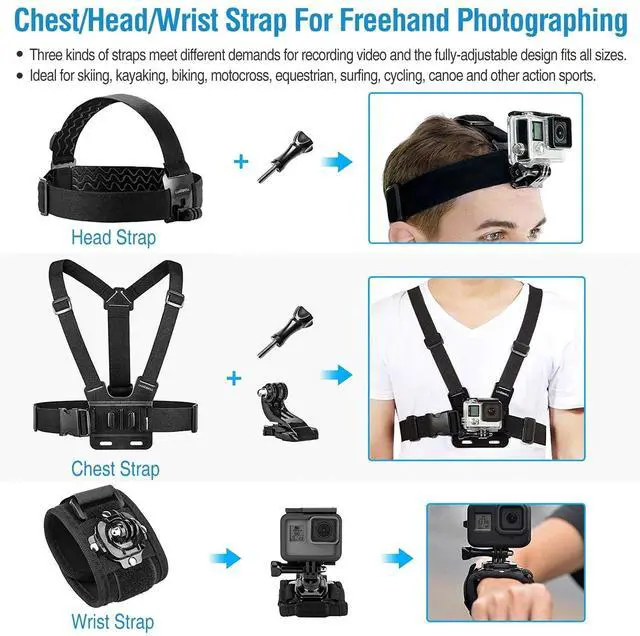 - Chest/Head/Wrist Strap For Freehand Photographing:The three kinds of straps can meet different requirements for recording video and the fully-adjustable design fits all sizes,ideal for skiing,kayaking,biking,motocross,equestrian,surfing,cycling,canoe and other action sports.