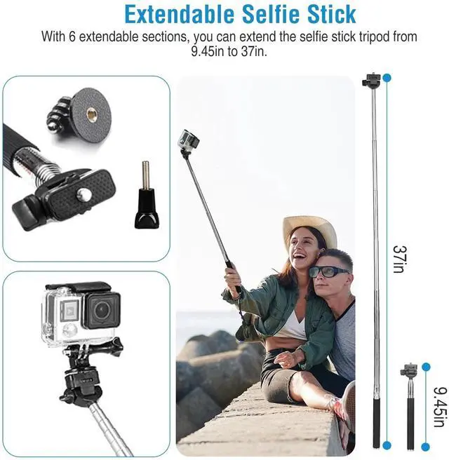 - Extendable Selfie Stick:Come with 6 extendable sections,you can extend the selfie stick tripod from 9.45in to 37in for static or close-up shots or to capture excellent point view footage and have a beautiful outlook!