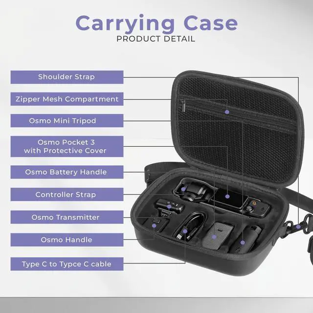 Take your DJI Osmo Pocket 3 Gimbal Camera experience to the next level with the Aries Carrying Bag, specifically designed for the Creator Combo. This carrying bag is the epitome of protection and convenience, crafted with meticulous attention to detail to ensure maximum utility. Its compact yet spacious design allows you to securely store your DJI Pocket 3 along with essential accessories such as a tripod, endurance handle, threaded handle, and microphone. The interior features a zippered mesh pocket and a precisely molded compartment, keeping your equipment organized and safeguarded during transport.