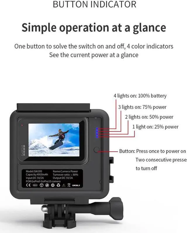 • Long operating time: Avoid frequent battery changes during normal shooting. Thanks to the 4800 mAh battery capacity, the external battery can work up to 210 minutes, which means that the GoPro Hero 9 / Hero 10 Black can work for about 3.5 hours without having to replace the battery.