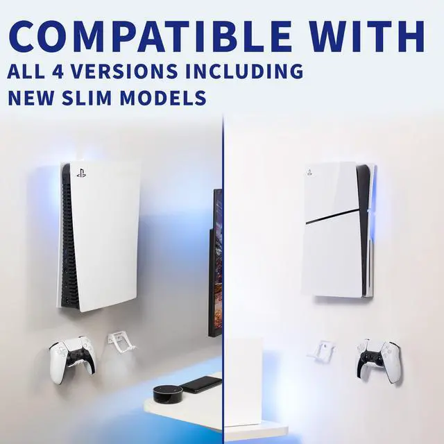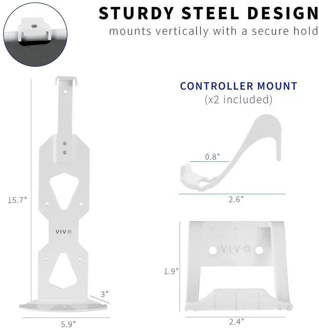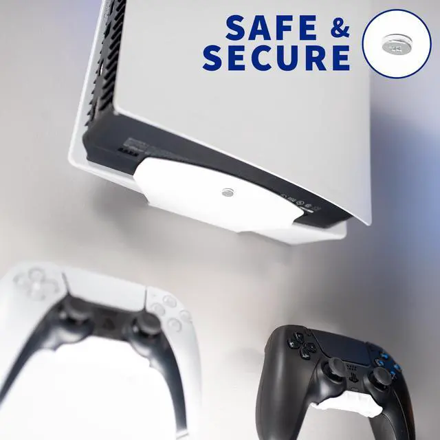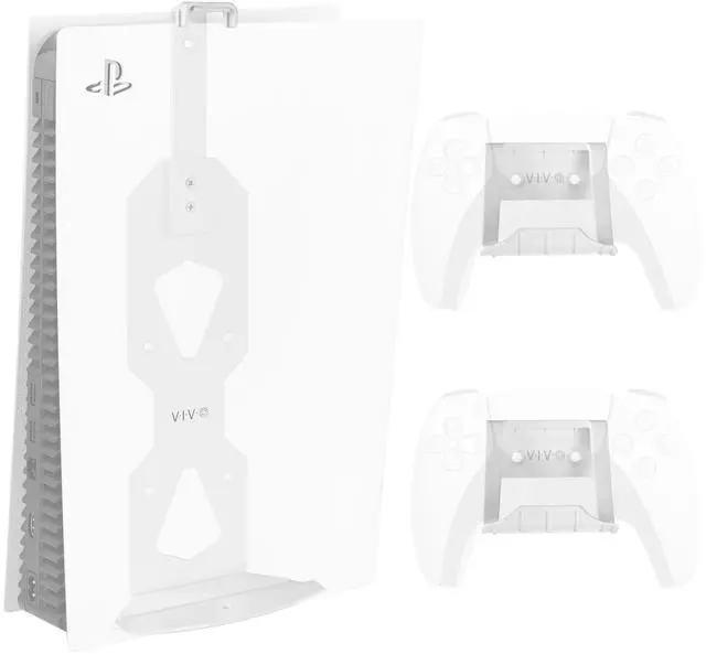 Customize your gaming setup with the White Wall Mount Designed for PS5 + 2 Controller Mounts (MOUNT-PS5W) from VIVO! Made of high-grade steel for excellent support, this versatile mount will hold your PlayStation 5 in a safe, convenient location for all your gaming adventures. The bracket design supports vertical orientation, 2 controller mounts are included for additional organization, and mounting hardware is provided for wood stud and drywall installation. The open design keeps your PS5 from overheating, and a security bolt and support brackets give maximum protection.