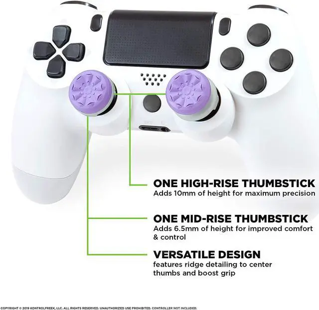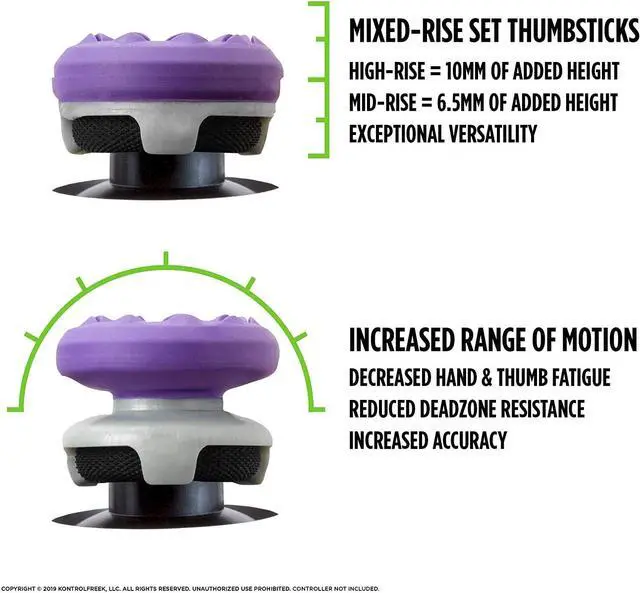 INCREASED ACCURACY - Mixed height combo for faster target acquisition and increased precision on the right, as well as better control and maneuvering on the left IMPROVES COMFORT & GRIP - Non-slip, proprietary rubber compound offers exceptional grip and requires less force which reduces wrist, hand and thumb fatigue ONE HIGH-RISE (CONCAVE) THUMBSTICK - That adds 10.0 mm for increased accuracy on right analog ONE MID-RISE (CONCAVE) THUMBSTICK - On the left analog for enhanced control with in-game movement while adding a nominal height of 6.5 mm VERSATILE - The added grip and comfort works well across your entire library of games and protects stock thumbsticks from wear and tear *Packaging May Not Reflect Updated Compatibility