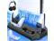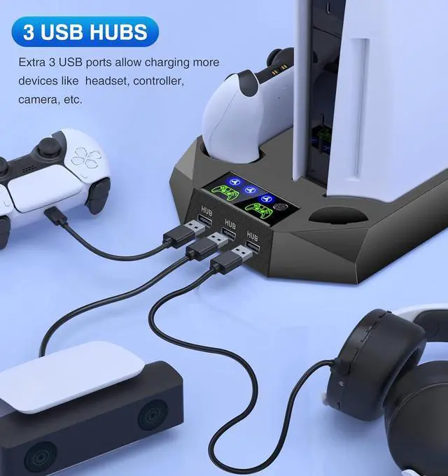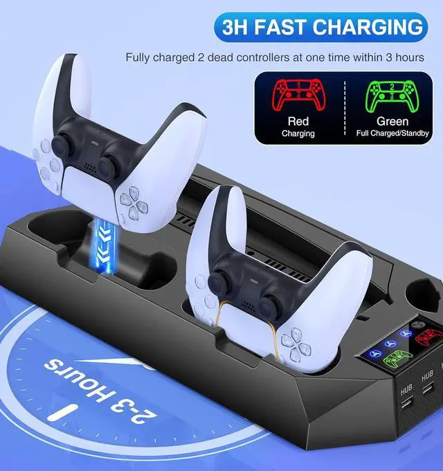 2 H FAST CHARGING WITH DUAL CONTROLLER CHARGER: This controller stand with dual ps5 charger provides a lot of power for charging 2 control ps5 with 1 cord plug in play stations. 5 console so only waste 1 usb port instead of both. Easy for dualsense controllers charging in one charger station, at once and no struggling to find other charging dock, no longer have multi charging cable everywhere. The ps5 controller dock will charge two ps 5. controller under 2h.