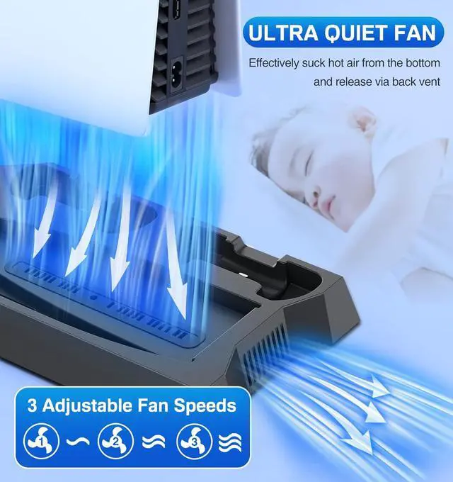 3 USB PORTS+3 ADJUSTABLE FAN SPEEDS: This ps5 console stand provides gamers more USB ports on sony ps5, plug it into ps5 disc version console's USB port. Pluging in other external USB storage devices, using ps5 remote, ps5 wireless headset, ps5 HD Camera and other usb connection simultaneously. The fan for ps5 also have the cooler ability to cooling down the pa5, 3 speeds (high, mid, low), PS5 fan can turns on/off by switching the speed level.