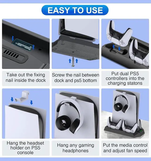 SLIM SPACE FRIENDLY FOR HOLDING ALL PS5 ASSOCERIES: If you needed something small but that would hold all ps5 bundle, the ps5 cooling system is just the right size especially for gamer in small game spaces, small enough to fit on any compact desk size. This really helped organize all ps5 controller accessories, ps5 headset wireless, media remote control for ps5, etc. and save you room, especial size friendly for playstation 5 console owner.