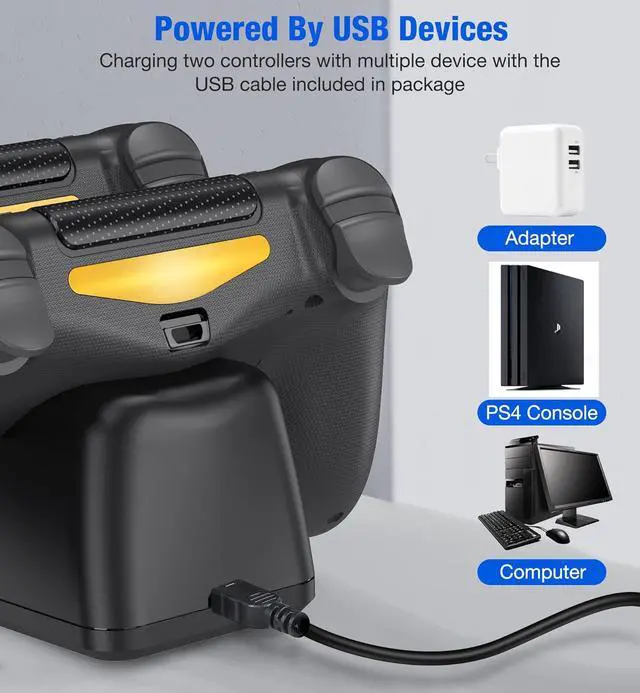 Multi Power Supply Devices& Compatibility The ps4 charging station power through the USB port from either the PS4/ PS4 Slim/ PS4 Pro console, PC or wall power source (Note: wall adapter is not included! ) And the controller charging station for playstation 4 controller can compatible with Sony PS4 PS4/ PS4 Pro/ PS4 Slim Controller perfectly for Playsttion 4 Games.