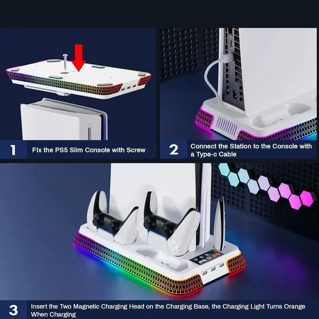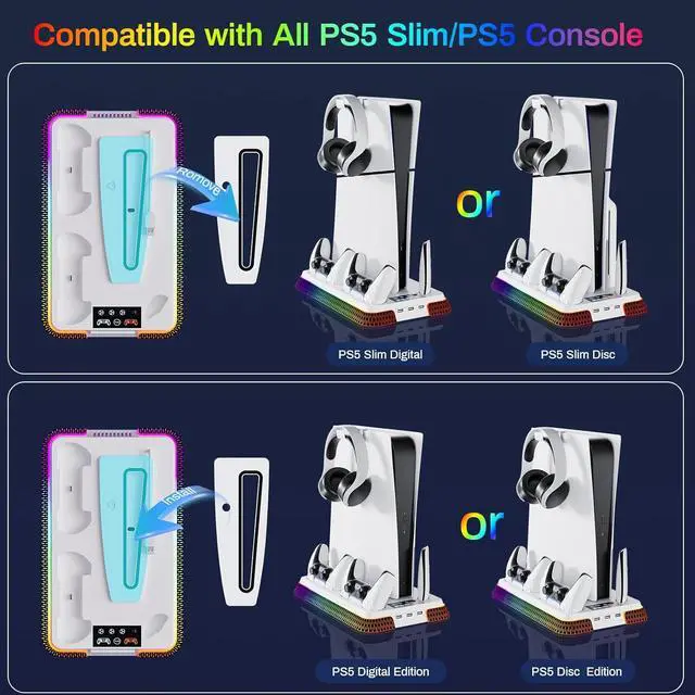 PS5/Slim/Pro Cooling Station - This stand for ps5 is suitable for all ps5 console digital edition, ps5 console disc version and 2023 PS5 slim console (CFI-2000A01, CFI-2000B01), PS5 Pro console (CFI-7019B01X). Comes with a screw to lock your ps5 console that keeping all cargador mando ps5 gaming assecorries secure and balanced, and a ps5 and ps5 slim adapter to fit your new console. It also matches the aesthetic of playstation 5 console. A perfect ps5 storage expansion charging dock to safely store dual sony dualsense controllers and display all ps5 assecories and console.