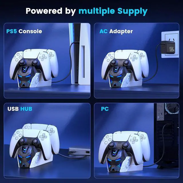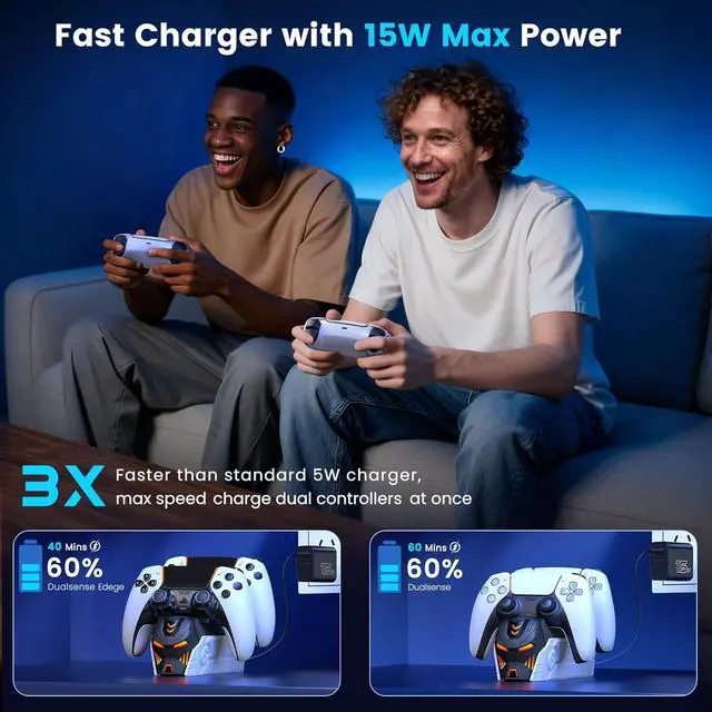 Upgraded with AC Adapter for P5 Controller DualSense and DualSense Edge Charging Upgraded AC Adapter designed to simultaneously charge up to two DualSense wireless controllers, this charger station is also compatible with DualSense Edge controllers. The P5 controller charger station features LED ambient light, you will notice a significant difference with this p5 controller accessory kit for the P5 DualSense