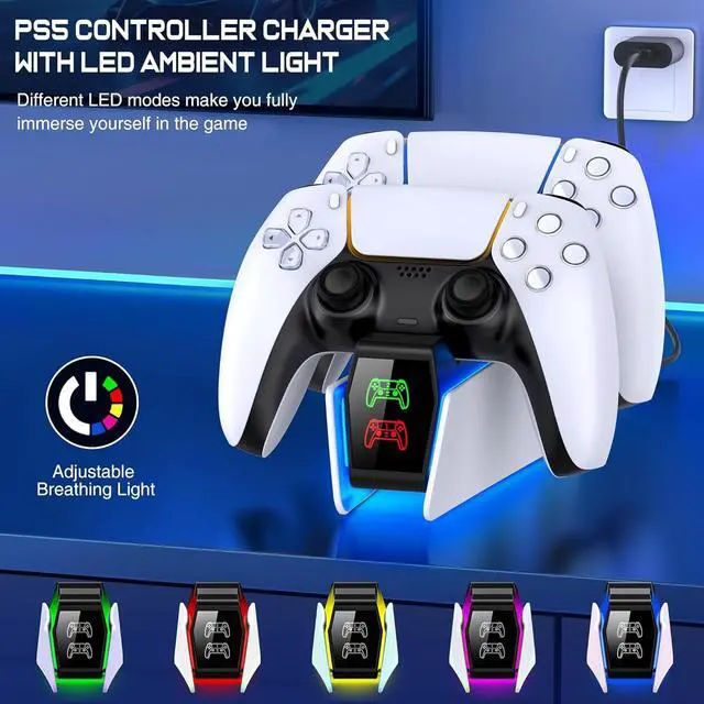 Multi-color Breathing Ambient Light The PS5 controller charging dock features cool LED ambient light. The touch button allows you to control the LED light, with mode of ambient light available: multi-color breath light, and LED off mode. Its stylish design and colored lights add a sleek aesthetic to your PS5 console. The PS5 charging station also features a memory function for the light strip, which can automatically restore the previous light mode when turned on again