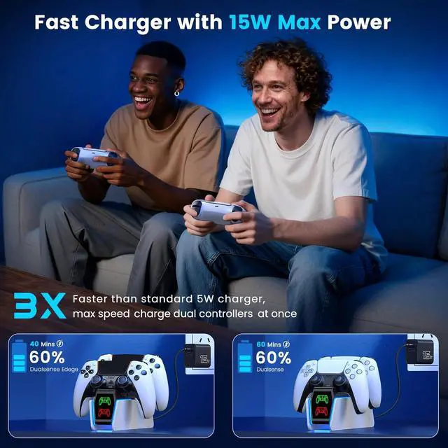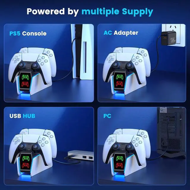 Upgraded with AC Adapter for PS5 Controller DualSense and DualSense Edge Charging Specially LED Ambient Light Designed to simultaneously charge up to two DualSense wireless controllers, this charger station is also compatible with DualSense Edge controllers. The PS5 controller charger station features LED ambient light on both sides, creating a relaxing and romantic environment that will make you feel immersed and relaxed. You will notice a significant difference with this ps5 controller accessory kit for the PS5 DualSense
