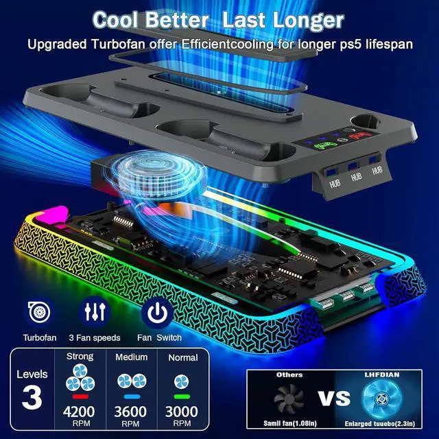 Efficient PS5 Cooling System - The ps5 fan cooling fan equipped with a powerful turbo fan offering three adjustable speeds (3000RPM, 3600RPM, 4200RPM), this ps5 cooler effectively dissipates heat, preventing overheating and extending the lifespan of your PS5 console.