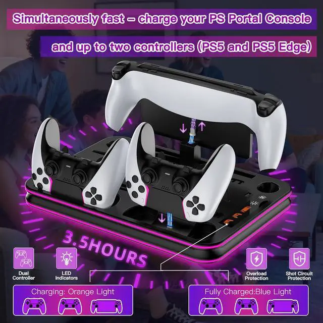 Fast Simultaneous Charging for PS5 Controllers & PS Portal This charging dock supports charging for two DualSense controllers, the DualSense Edge controller, and the PS Portal at the same time. LED indicators clearly show charging statusorange while charging and blue when fully charged.