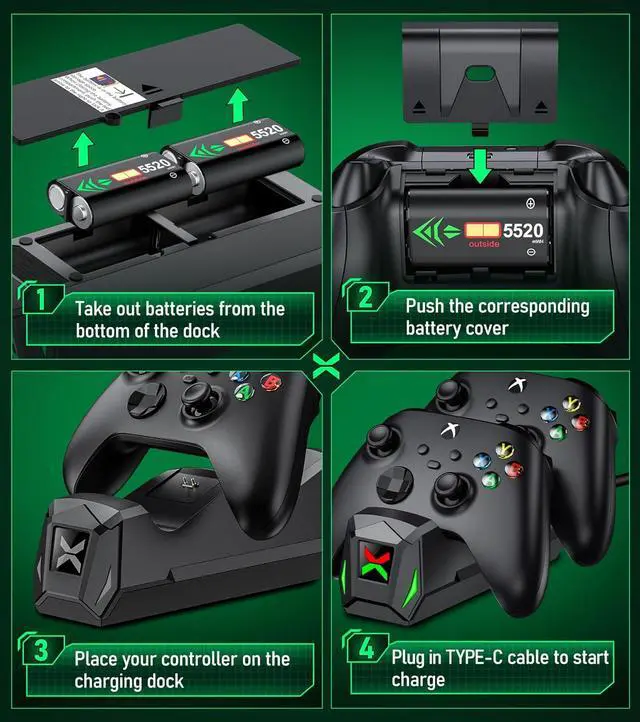 Xbox Controller: Package including 2 x 5520mWh Xbox one controller battery pack (Controller not included), the rechargeable battery pack for Xbox one controller provides you 18-25hrs long playing time but only needs 4-5hrs charging time. With two battery slots and upgraded battery capacity to extend your gaming time, and never miss a second of gaming (please note the batteries on the bottom of dock)