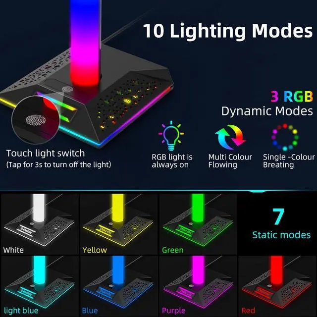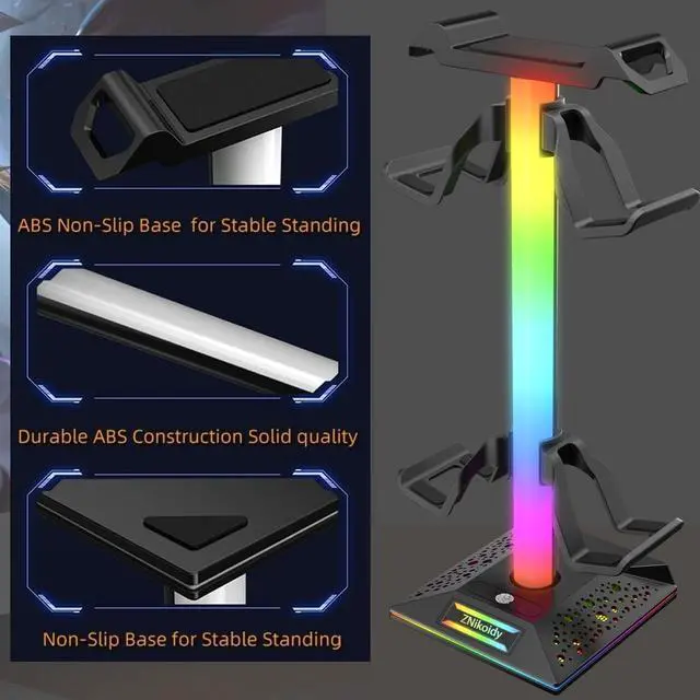 Humanized Designthe soft rubber on the holder to prevent scratches the headsetpartial shading design of the light tube, for a better lighting experience, ABS Non-Slip Base for Stable Standing.