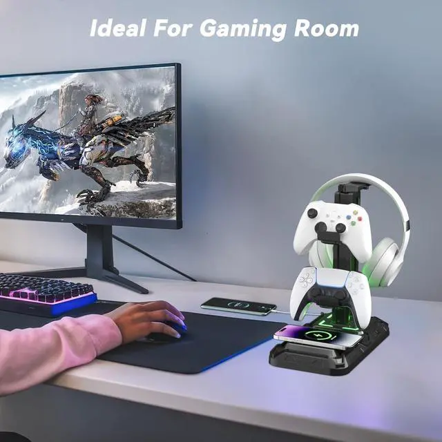 Detachable Controller Hook & Rotatable Headphone Stand - Holds one headset and two controllers, or four game controllers at the same time. The headset stand rotates 360°and is designed with cable storage.