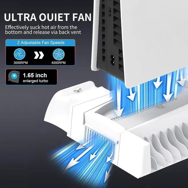 Upgrade PS5 Cooling Fan & 4 USB Hubs: Fivtek ps5 cooling station is equipped with a powerful turbo fan( 1.65 inch) featuring 2 adjustable level fan speeds(Strong, Normal), provides efficient and low-noise cooling to highly reduce your console' s temperature and prolonging the lifespan. Extra 4 USB hubs on dock is convenient for gamer who owns different gaming peripherals, like external storage, wireless headset, wire controllers, DONT need to remove existing set up while using the cooling dock. It' s a must-have playstation accessory for every PS5 gamer.