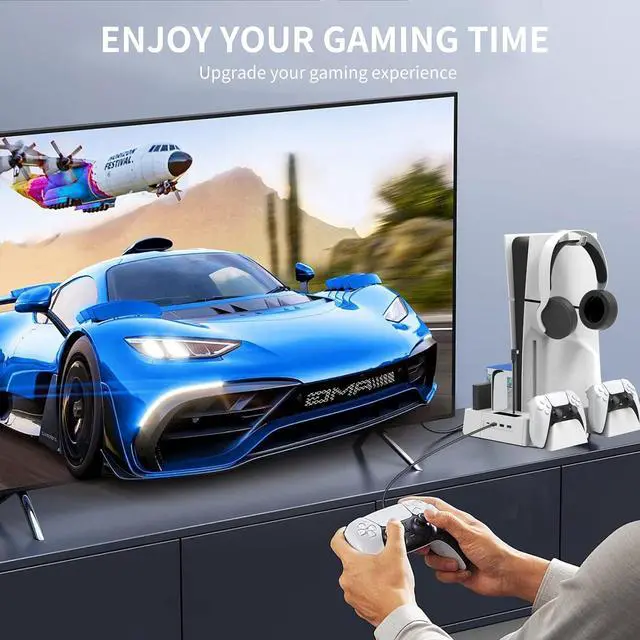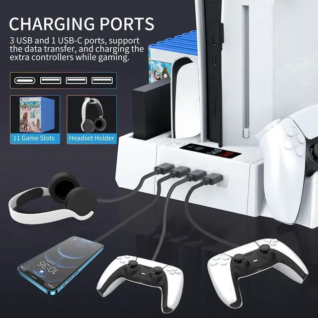 All-in-One PS5 Accessories Organizer: This PS5 cooling station is designed to hold 11 game disc, ps5 headset, ps5 controllers, ps5 media remote, and your ps5 console all in one place. It helps save space, keeping your favorite games at your fingertips and your gaming area tidy. It' s a great choice for ps five gamer who need a neat organizer for tons of gaming accessories.