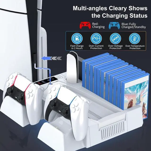 Safe Charging Protection: The PS5 charging station includes overcharge, overvoltage, and short-circuit protection features, automatically stopping at 70% to extend controller battery life. The PS5 docking station is designed to minimize wear on the charging ports, ensuring long-term durability. Its a mens gifts for playstation, a best playstation 5 accessories stuff replacement for sony-official vertical base stand.