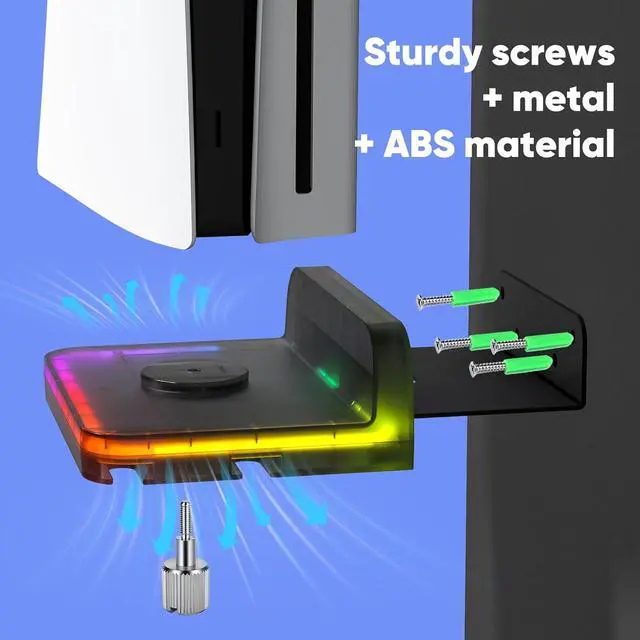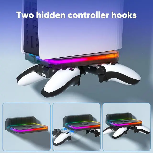 2 Controller Slots&RGB lightsOur wall mount design comes with two controller slots. You can place your ps5 controllers on the wall for easy access and to save space in your entertainment center. RGB lighting allows you to enhance the atmosphere of the game you' re playing.