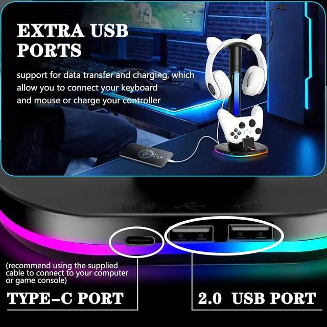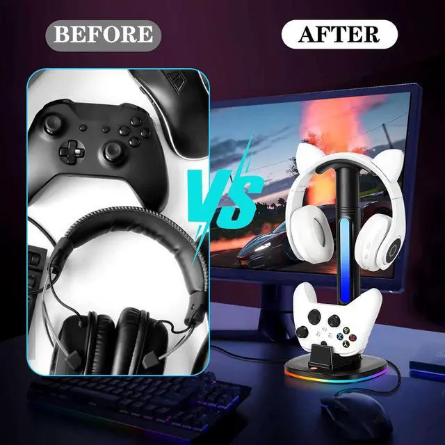 Stand for Controller & HeadsetYou deserve a neat and convenient gaming space. Our controller charging station with headset stand can charges your headset while it' s stored, the controller can also be placed on the charging base for charging, and the rgb light provides the gaming ambience for you and extra usb port allows you to connect your mouse and keyboard, or charge other electronic devices.