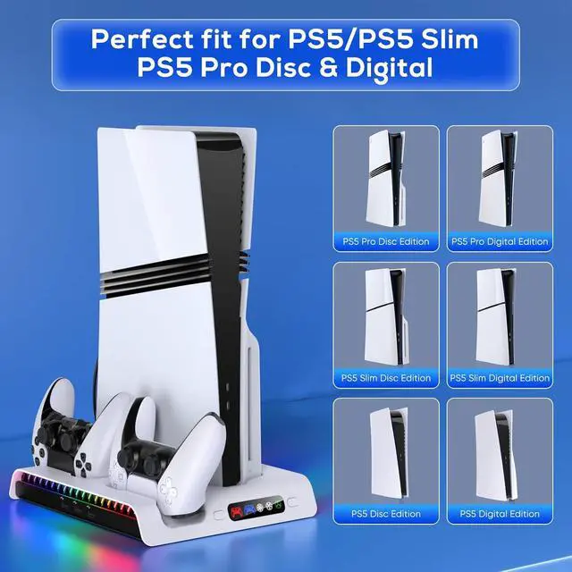 RGB Charging Stand for ALL PS5 VersionsThe stand for PS5 console is specially designed for PlayStatio5, PlayStatio5 Slim and PlayStatio5 Pro Digital & Discs Edition, The cooling station for PS5 equipped with dual controller charging port can charge for dualsense/edge controllers. The Original PS5 2020 console can be perfectly installed through the PS5 groove, meeting the needs of all your PS5 models.