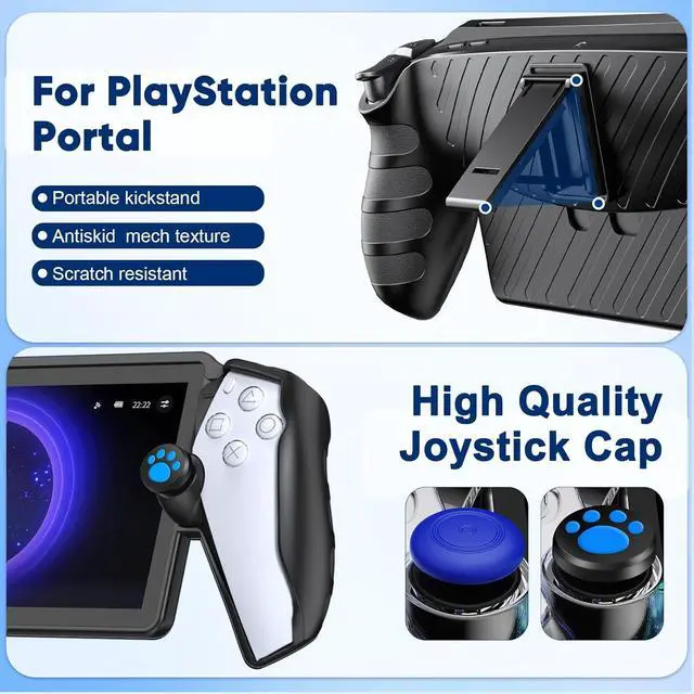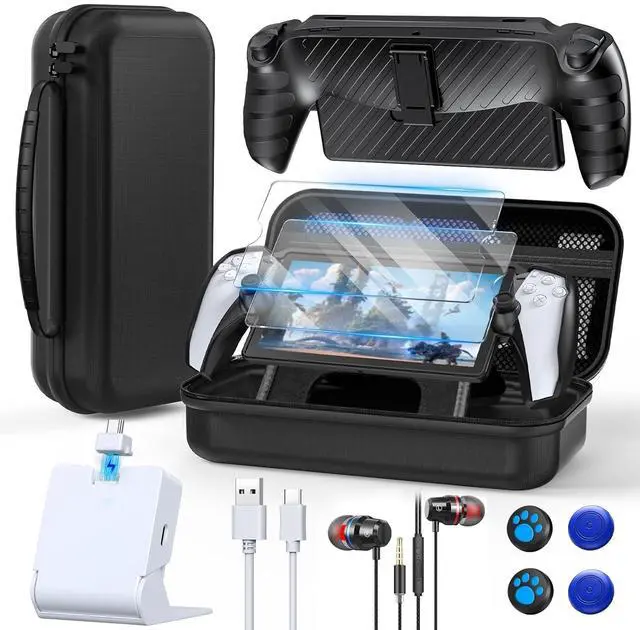 13 in 1 Accessories Kit for playstation portal remote player: This kit includes 1* hard carrying case, 1* protective skin case, 1* charging dock station, 1*charge cable, 4*thumb grips, 1* Wired Headset, 2*HD tempered screen protectors and 2*cleaning kits for Playstation Portal remote player. Provide all-round protection against drops, shocks, scratches, dust, and fingerprints for PS Portal console.