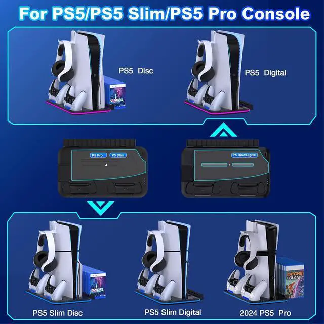Compatible with PS5/Slim/Pro ConsolesThis multifunctional ps5 stand includes two interchangeable panels, making it compatible with the 2020 PS5, the 2023 PS5 Slim (CFI-2000A01, CFI-2000B01), and the new 2024 PS5 Pro (CFI-7019B01X) consoles. The ps5 stand is designed with screw holes and comes with security screws to ensure your console is securely fixed to the stand, providing enhanced stability and organization