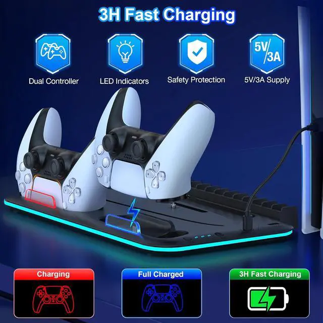 High-Speed PS5 Charging Station with LED IndicatorsThe ps5 charging station quickly charges two controllers in just about 3 hours. The clear LED indicators show red when charging and blue when fully charged, so you can easily monitor the status. When not in use, simply store your controllers on the ps5 station to save time and keep them organized