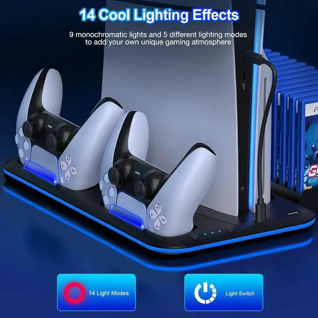 Colorful Light Modes for PS5 StandThe ps5 pro stand features 5 colorful lighting effects and 9 solid color modes, including slow flash, breathing light, fast flash, single-color gradient, and dual-color gradient, adding a stunning visual effect to your gaming space. Easily switch between different modes using the dedicated light button on the ps5 cooling stand. The vibrant dynamic lighting creates an immersive gaming experience, making your game world even more exciting