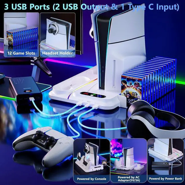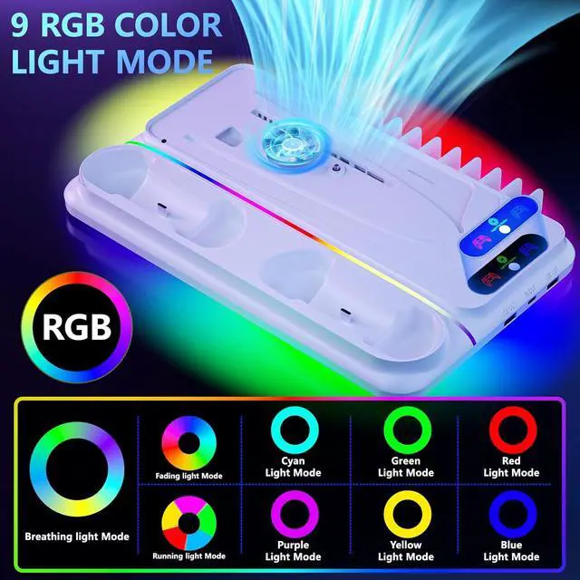 USB Charging Ports: ps5 cooling stand has 9 different modes containing 7 single color mode as well as 2 multi-color breathing fast/slow modes, which create cool gaming scenes and immerse yourself in the game world! Built-in 3 USB Charging Ports(2 output port/1 input port) allow to connect with device like power bank, adapter and computer