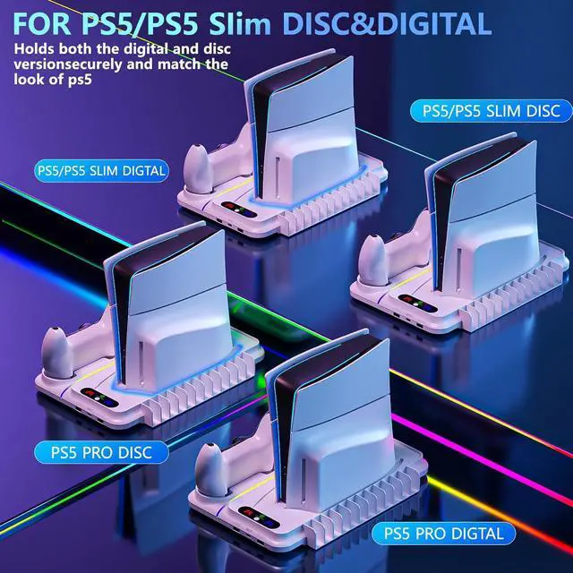 Slim Digital & Disc Console: PS5 stand is designed for PS5 generations, embracing PS5 Pro and Slim Disc & Digital version, comes with a safety screw well equipped to the ps5 vertical stand system to securely connect the ps5 console to the ps5 base station