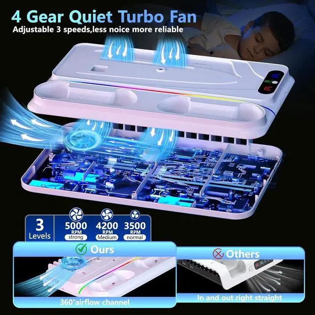 3 Turbo Slient Cooling Fan: Our ps5 cooling station is equipped with a powerful turbo fan featuring three adjustable level fan speeds, provides efficient and low-noise cooling to highly reduce your console' s temperature