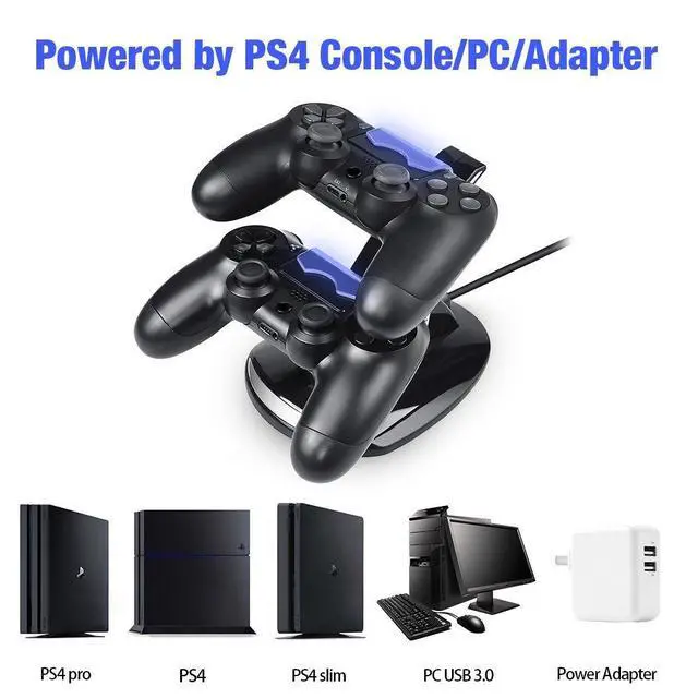 Dual-Port Compatibility, Flexible Power Sources: This Dual USB PS4 Charger Dock is Compatible with PS4/PS4 Slim/PS4 Pro; powered via console USB, PC, or power bank (wall adapter not included). Charge 2 controllers anytime, anywhere!