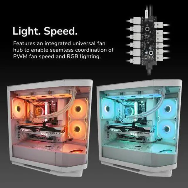 The FV270 RGB offers an unparalleled panoramic view of the interior with a tempered, curved glass perimeter. Unlike rectangular cases, this prism-inspired design eliminates obstructive straight edges and vastly increases transparency, amplifying both visibility and lighting brilliance.