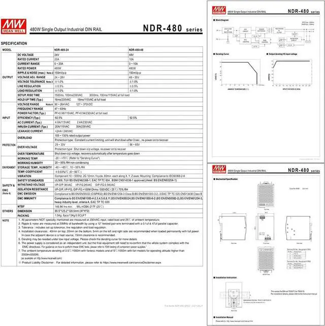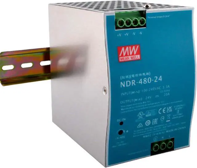 The Mean Well NDR-480 is a 480W single-output DIN rail power supply designed for demanding industrial applications. This compact and efficient unit accepts a universal AC input voltage range of 90-264VAC and provides a stable 24V DC output, making it suitable for a wide range of industrial devices and systems. Designed for optimal thermal performance, the NDR-480 utilizes a metal housing and operates efficiently with natural convection cooling. Its comprehensive protection features, including short circuit, overload, overvoltage, and over-temperature protection, enhance the reliability and longevity of your installations. Meeting UL 508 and BS EN/EN61000-6-2 standards, the NDR-480 is a reliable power solution for factory automation, industrial control systems, and various other industrial applications.