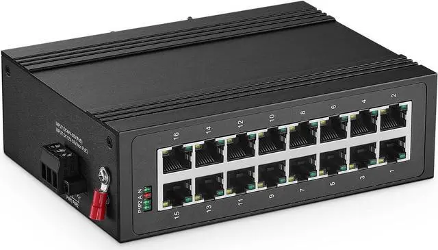 16 GE PortsThis din rail switch include 16 gigabit ethernet ports, all support 10/100/1000Mbps adaptive. 32Gbps switching capacity with better performance. Plug and play, directly connected to the peer device, no need to configure the port