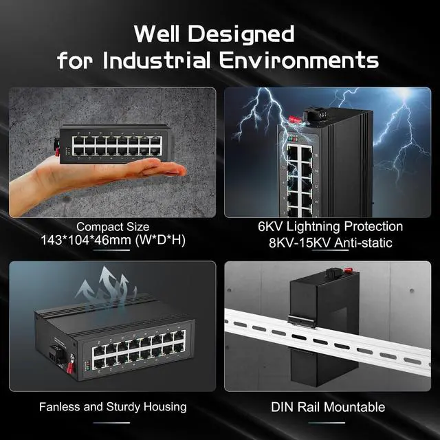 Industrial IP40This is a industrial grade switch, using sturdy aluminum alloy casing and industrial grade electronic components, working temperature -40~75°C(-40~185°F), anti-lightning, anti-static and anti-overload protection