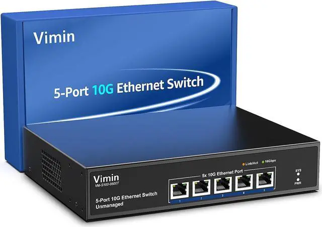 5-Port 10G Ethernet Switch Unmanaged, VIMIN 10Gbe Network Switch with Base-T RJ45 Ports Support 100M/1000M/2.5G/5G/10G Speed Auto-Negotiation, for 10G NAS Network,PC,10G NIC, WiFi7 Router,Plug & Play