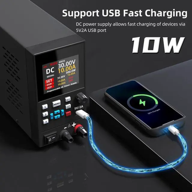 Front 5V2A USB charging interface. One click output on/off, one click voltage and current stabilizing switch, automatic locking menu key to prevent incorrect operation