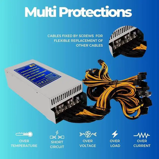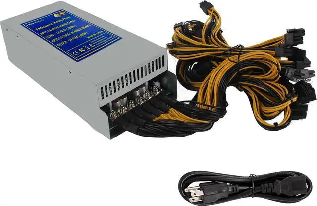 Product Configuration Rated power 3300W: High power mining PSU with 86+2Pin and 6 Pin connection cords 12V output , work under voltage180V-264V. Hight efficiency with more than 80 %. Please reasonably calculate the consumption of the GPUs and reserve 300-400W for the motherboard and other cables.