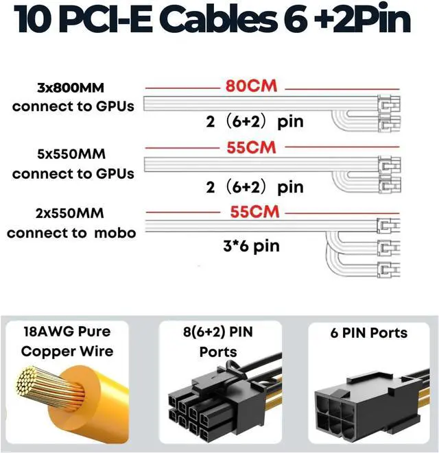Included In The Package10 connecting cables, 22 connectors 8 (6 + 2) pin*16, 6pin*6, and 1 Power Cord. Cables are made with all-copper lines, providing multiple power protections against over current/over voltage/voltage regulation/short circuit/lightning/overload