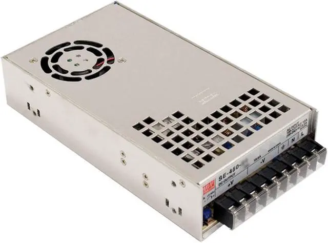 The product type is Mean Well SE-450-12 Enclosed Switching AC-to-DC Power Supply, Single Output, 12V, 37.5A, 450W, 2.0" H x 4.9" W x 8.9" L. Made in China and manufactured by Mean Well.