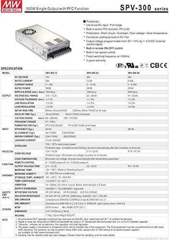 High power factor power models, models is mandatory for export to europe. The built-in active power factor correction circuit (PFC) is beneficial to improve energy utilization and reduce harmonic interference, global full range voltage input and complete function. The output voltage of the SPV series power supply can be adjusted to the original rating of 20~110%