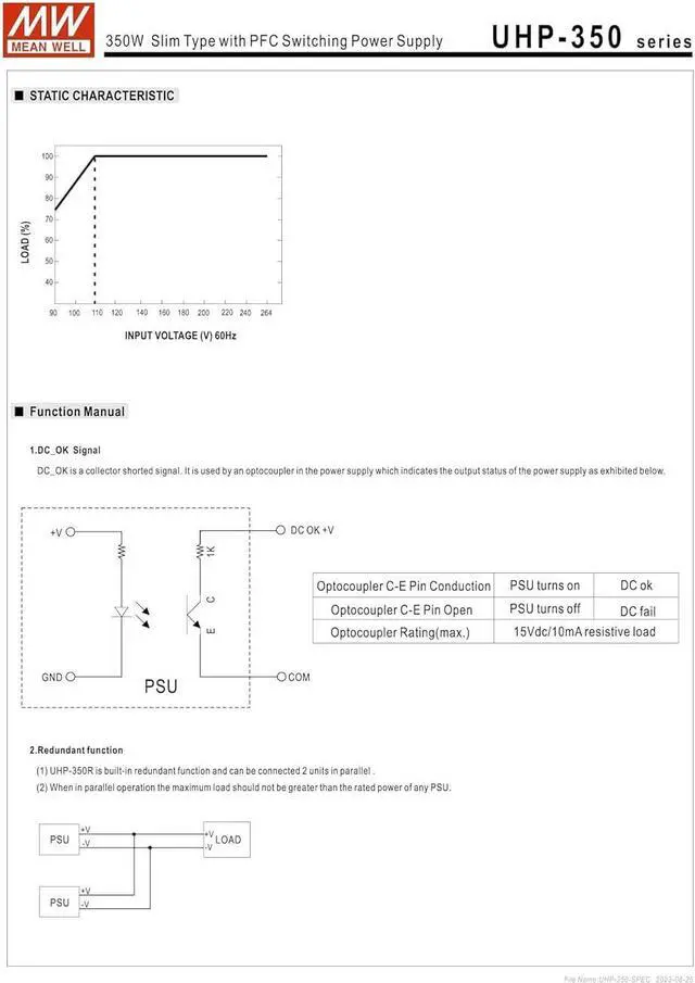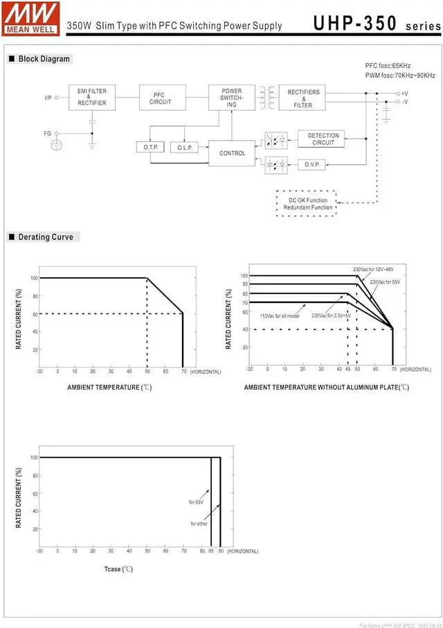 UHP-350 series is a single-output slim type power supply with 31mm of low profile design.Adopting the full range 90~264VAC input, the entire series provides an output voltage line of 3.3v,4.2V,5V,12V,15V,24V,36V,48V and 55V.In addition to the high efficiency up to 94%, that the wholeseries operatesfrom -30 ~ 70 under air convection without fan.UHP-350 has the completeprotection functions and 5G anti-vibration capability;lt is complied with the international safetyregulations such as TUV BS EN/EN62368-1,BS EN/EN60335-1,UL 62368-1 and GB4943.UHP-350 seriesserves as a high performance power supply solution for various industrial applications.