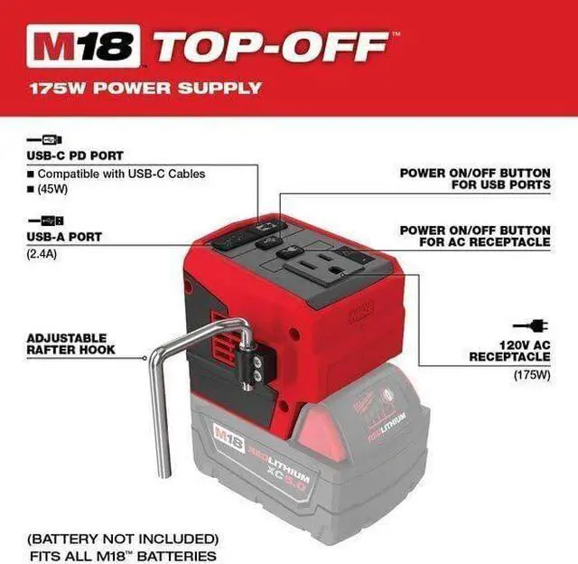 Ideal for laptops, cellphones, TVs, and other small devices Rafter hooks allow for versatility on the job site to hang on common materials or carts Lightweight, compact design Battery, charger, and device cords not included Includes: AC 120V Outlet, USB-C PD (45W) Port, and USB-A (2.4A) Port