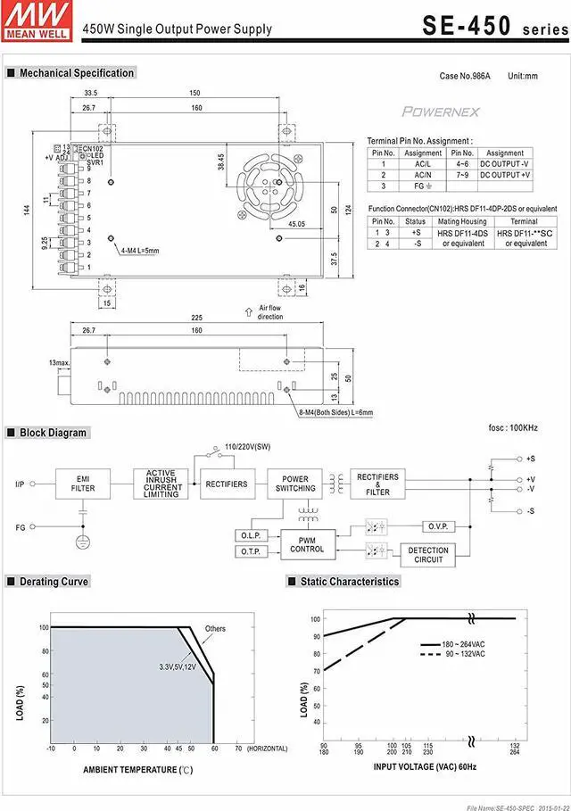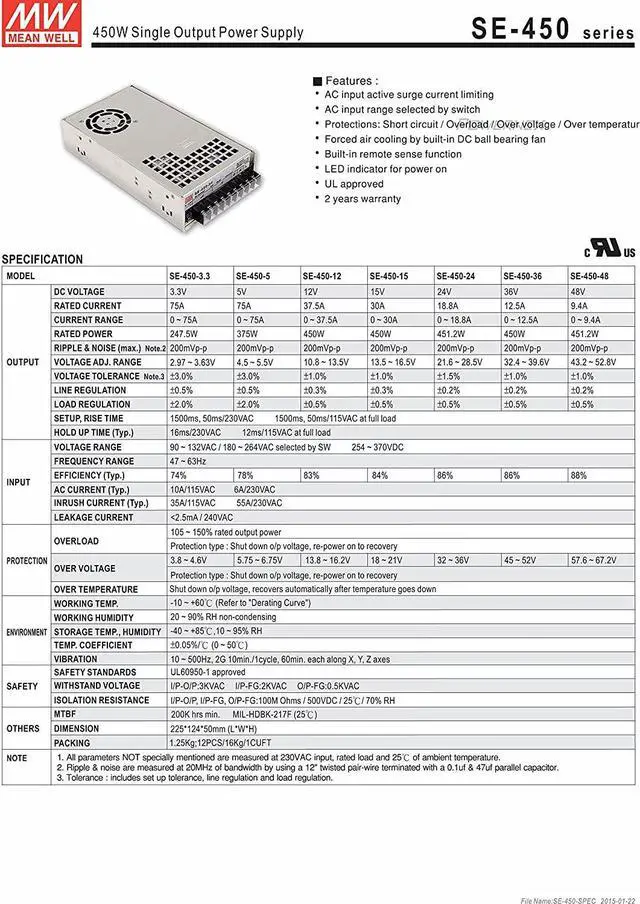 SE-450-5 AC/DC Power Supply Single-Out 5V 75A 375W 9-Pin